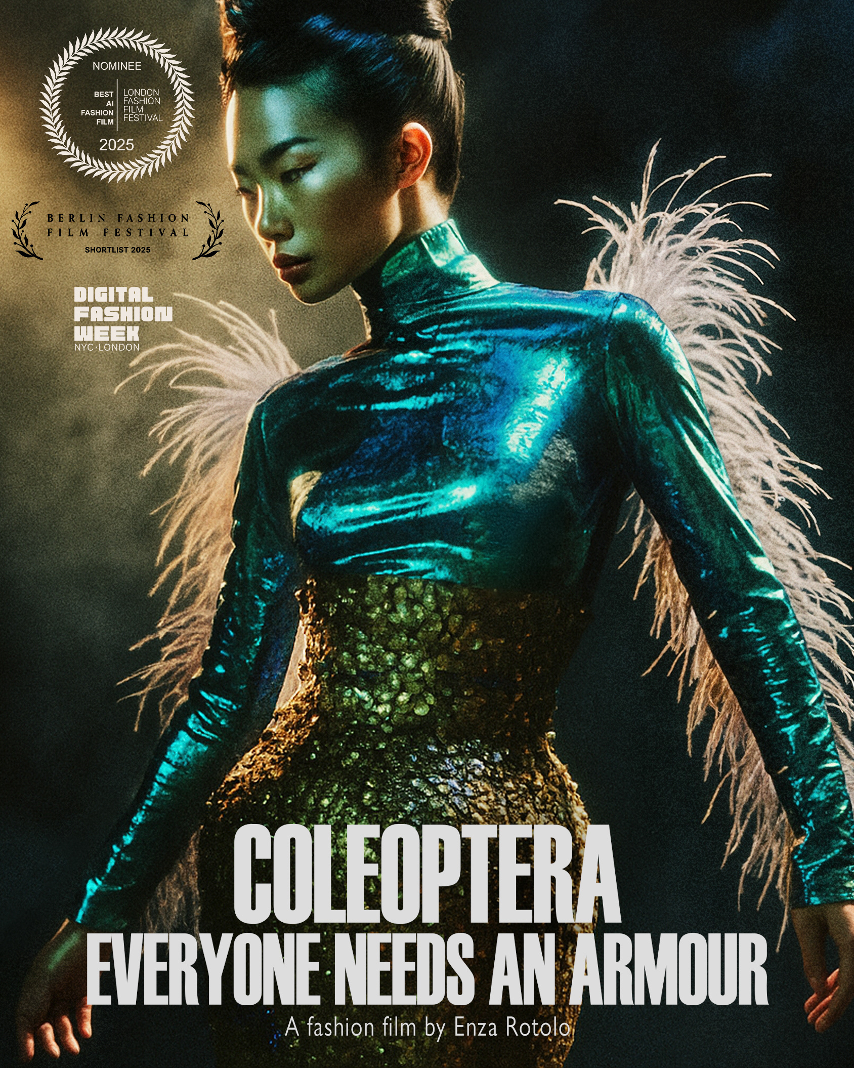 Coleoptera - Everyone Needs an Armour is a short fashion film that explores resilience, metamorphosis and the armour we carry. Inspired by Coleoptera and the elytra, their natural protective armour, the film uses fashion as a metaphor, portraying women as strong, enduring figures who evolve through light and shadow. This project began as a physical collection during my fashion studies in 2017 at Istituto Cordella, then expanded into new 3D digital designs in 2020 on DressX, and now emerges as a film. To create this project, I employed AI techniques alongside cinematic editing to reimagine how fashion imagery can convey themes of survival, identity and evolution. AI here is not a shortcut, but a tool to extend craft, allowing a deeply personal narrative, born from years of research into forms, colours and armour, to find new cinematic expression. At its core, the film is a meditation on strength, fragility and poetic brutality. But it is also part of a wider journey. Future chapters will expand this exploration to portray real women and their stories of resilience, whether facing violence, professional barriers or illness. The aim is to spark conversations about empowerment, protection and the light we carry forward. Since childhood, I have been fascinated by armour and coleoptera, with their resilience and beauty hidden beneath protective exoskeletons. Their shapes, their colours, their functions as pollinators...they are extraordinary creatures. Coleoptera reflects my exploration of how fashion, technology and storytelling merge to express strength and metamorphosis. This film is also about women: the armour we build, the light we carry, the evolution we undergo. My hope is that this work contributes to a wider dialogue on resilience and identity. Official Nomination - Best AI Fashion Film – London Fashion Film Festival, 2025 Screening at the Vue West End, London. Official Nomination - Berlin Fashion Film Festival, 2025 Screening in Berlin Official Selection – Digital Fashion Week, 2025 Premiere in New York & London